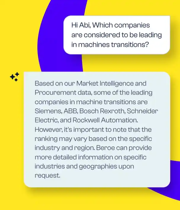 Abi is your one-of-a-kind AI-powered procurement advisor, available 24/7, with insights at your fingertips. Seamlessly integrated with MS Teams and Slack, abi leverages Beroe’s unmatched market intelligence to monitor category developments, supplier alerts, and benchmarks, turning complex data into actionable advice.