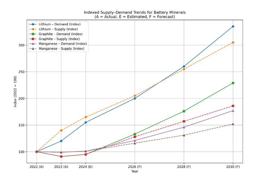 Lithium prices have risen globally on speculations of looming supply shortage by early 2030s. Other raw materials like graphite and manganese are also witnessing a widening supply demand gap, hinting at a potential supply deficit in medium term, depending on demand growth from EV vehicles, grid scale energy storage and consumer electronics. This has already increased forward prices and long-term contract floors. Export controls, processing concentration and qualification for IRA / FEOC-compliance is adding to the effect.