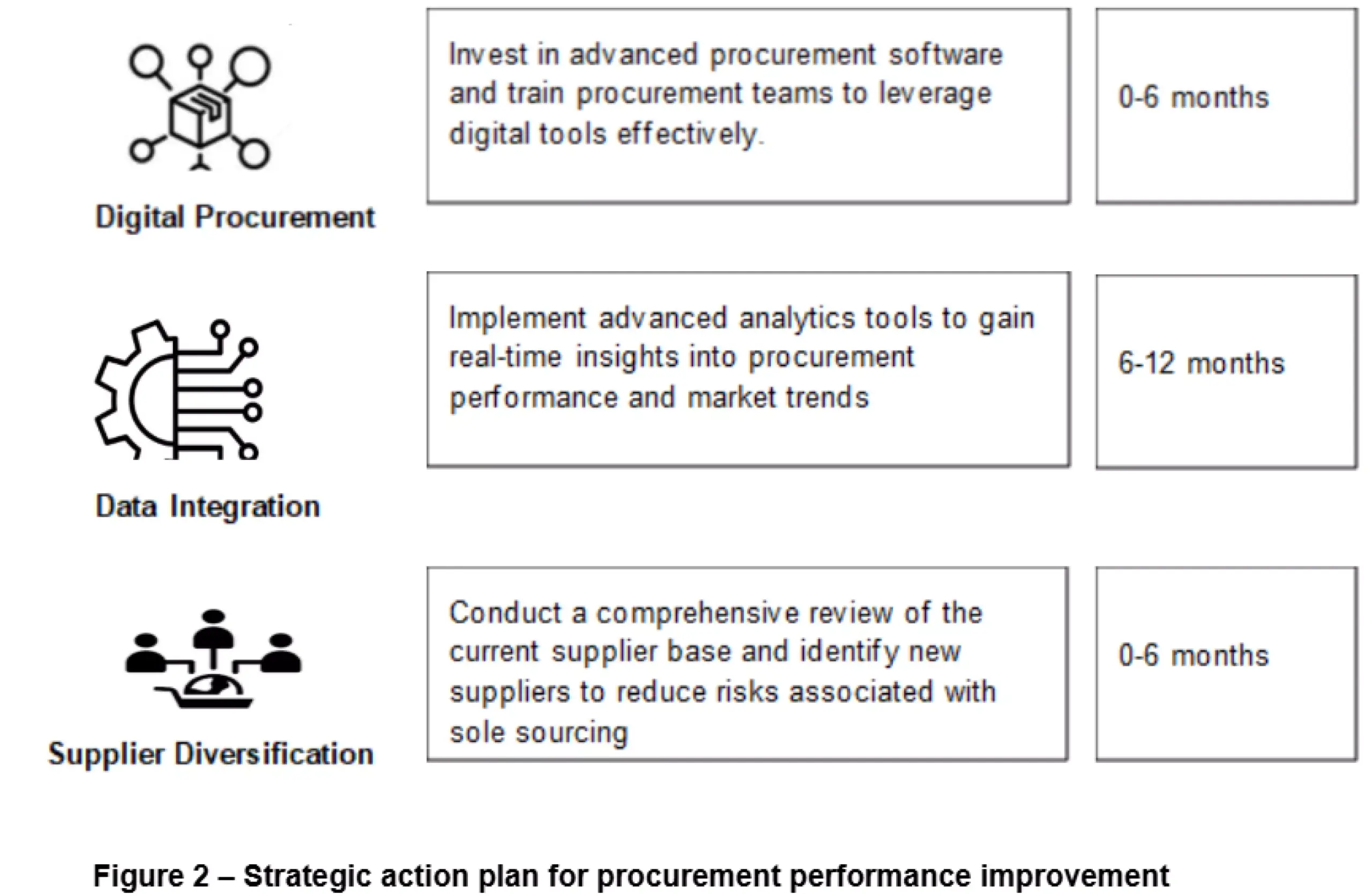 | Solution | Digital procurement transformation | Supplier diversification and strategic partnerships | Advanced data analytics for informed decision-making |