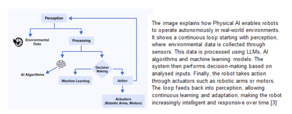 Industrial robotics has long been associated with precision, repetition, and efficiency. However, traditional robots operate within deterministic boundaries. They excel in structured environments but struggle when variability increases such as mixed SKUs, unpredictable layouts, or last-minute production changes. Physical AI changes this equation. Instead of relying purely on fixed programming, Physical AI systems combine advanced simulation environments, generative AI models, real-world sensor fusion, and reinforcement learning. The result is embodied intelligence, robots that understand context, interpret language-based instructions, and execute tasks with situational awareness.