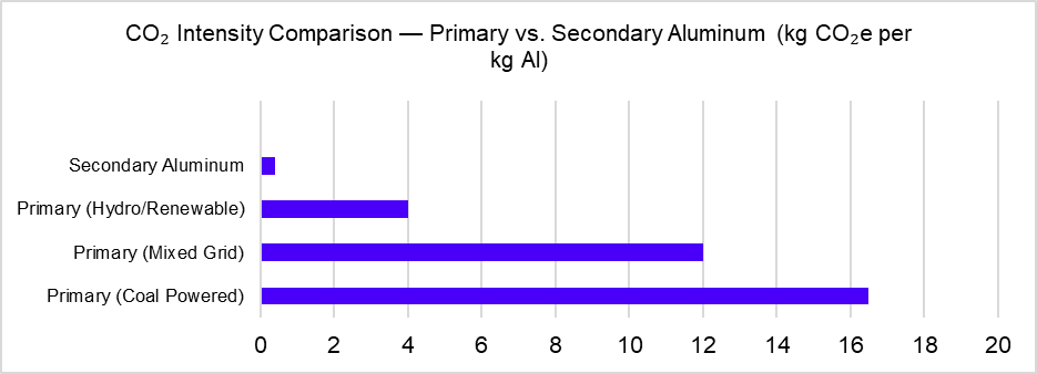 - The lifecycle emissions of secondary aluminum are typically just 4–5% of coal-based primary production, creating an emissions gap that directly affects procurement strategy. [4], [5]